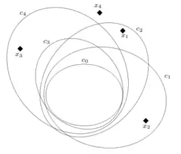 ![]() Two points outside c (thick circle) are sufficient to prevent a larger circle not containing them from including it |