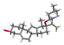 Cyclopamine (11-deoxojervine) is a naturally occurring steroidal alkaloid. It is a teratogenic component of corn lily (Veratrum californicum), which when consumed during gestation has been demonstrated to induce birth defects, including the development of a single eye (cyclopia) in offspring.[1] The molecule was named after this effect, which was originally observed by Idaho lamb farmers in 1957 after their herds gave birth to cycloptic lambs. It then took more than a decade to identify corn lily as the culprit.[2] Later work suggested that differing rain patterns had changed grazing behaviours, which led to a greater quantity of corn lily to be ingested by pregnant sheep.[3] Cyclopamine interrupts the sonic hedgehog signalling pathway, instrumental in early development, ultimately causing birth defects.