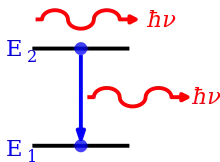 A photon with an energy equal to the difference E2 − E1 between the energy levels is released or absorbed in the process. The frequency ν at which the spectral line occurs is related to the photon energy by Bohr's frequency condition E2 − E1 = hν where h denotes the Planck constant.[2][3][4][5][6][7]