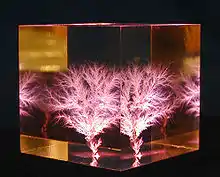 Unlike water trees, the individual channels of electrical trees are larger and more easily seen.[1][2] Treeing has been a long-term failure mechanism for buried polymer-insulated high voltage power cables, first reported in 1969.[3] In a similar fashion, 2D trees can occur along the surface of a highly stressed dielectric, or across a dielectric surface that has been contaminated by dust or mineral salts. Over time, these partially conductive trails can grow until they cause complete failure of the dielectric. Electrical tracking, sometimes called dry banding, is a typical failure mechanism for electrical power insulators that are subjected to salt spray contamination along coastlines. The branching 2D and 3D patterns are sometimes called Lichtenberg figures.