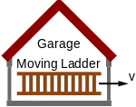 The ladder paradox (or barn-pole paradox) is a thought experiment in special relativity. It involves a ladder, parallel to the ground, travelling horizontally at relativistic speed (near the speed of light) and therefore undergoing a Lorentz length contraction. The ladder is imagined passing through the open front and rear doors of a garage or barn which is shorter than its rest length, so if the ladder was not moving it would not be able to fit inside. To a stationary observer, due to the contraction, the moving ladder is able to fit entirely inside the building as it passes through. On the other hand, from the point of view of an observer moving with the ladder, the ladder will not be contracted, and it is the building which will be Lorentz contracted to an even smaller length. Therefore, the ladder will not be able to fit inside the building as it passes through. This poses an apparent discrepancy between the realities of both observers.