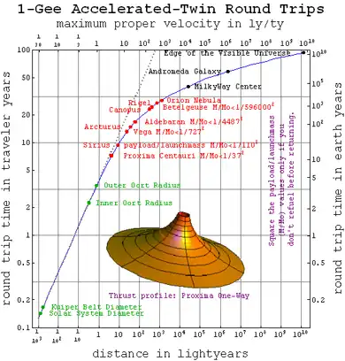 A spaceship using significant constant acceleration will approach the speed of light over interstellar distances, so special relativity effects including time dilation (the difference in time flow between ship time and local time) become important.[7]
